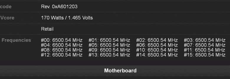 Напомним, рекорды, о которых мы рассказывали сегодня, были установлены при использовании жидкостного охлаждения и разгона CPU до 5,4-5,55 ГГц. Как можно видеть на скриншоте CPU-Z, процессор вполне может работать и на 6,5 ГГц, и это частота у всех ядер.