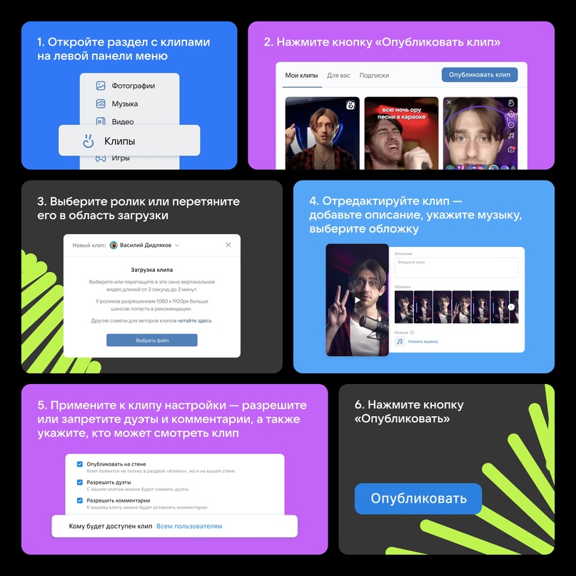 Загрузить ролики можно при помощи кнопки «Опубликовать клип» в разделе «Клипы» в левом меню версии «ВКонтакте» для компьютера. Как и в мобильном приложении «VK Клипы», пользователи сайта могут публиковать видео продолжительностью до трёх минут в высоком разрешении Full HD и с поддержкой частоты кадров 60 к/с. Публиковать клипы с компьютера могут как простые пользователи, так и сообщества.