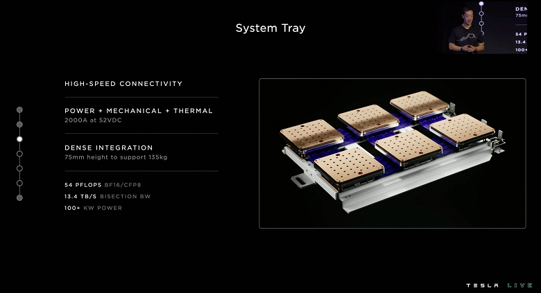 «Мы знали, что нам нужно пересмотреть каждый аспект инфраструктуры центра обработки данных, чтобы обеспечить беспрецедентное охлаждение и плотность мощности», — заявил Билл Чанг, главный системный инженер Tesla по проекту Dojo.
