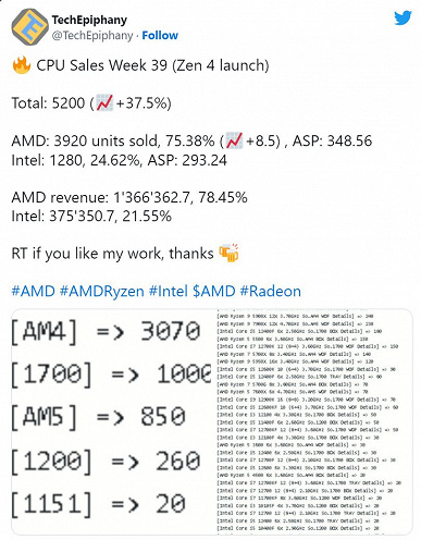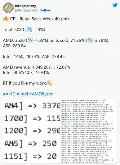За 40 неделю текущего года, в период с 3 по 9 октября, было реализовано всего лишь 250 процессоров Ryzen 7000 – на 70% меньше, чем за дебютную неделю! С чем связано это, непонятно. Но нужно отметить, что в целом за 40 неделю года продажи процессоров снизились: если на 39 неделе ретейлер реализовал 5200 процессоров, то за 40 неделю было продано 5080 процессоров. К тому же доля CPU AMD снизилась с 75,38% до 71,26%. Соответственно, доля Intel увеличилась.