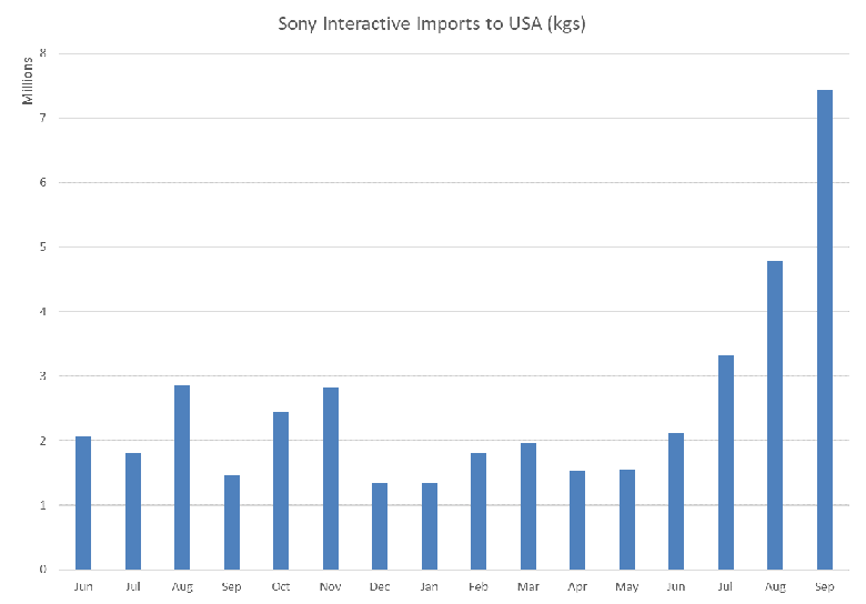 Если точнее, речь идёт о 7 млн кг против 1,5 млн кг годом ранее. Почему информация об импорте в данном случае выражается в массе, не уточняется. В месячном выражении рост также значительный, хотя и вовсе не такой: в августе Sony импортировала 5 млн кг.