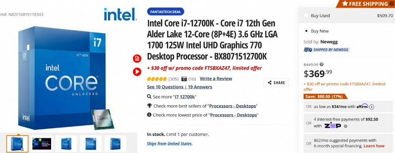 Выгодная цена установлена и на Core i7-12700K: в США его можно приобрести за 340 долларов вместо официальных 450.