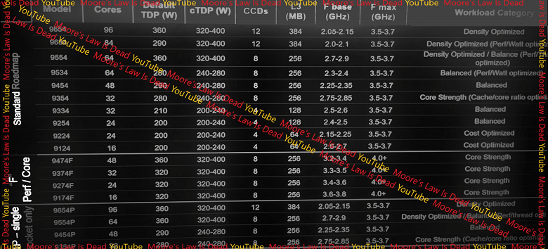 Согласно свежим данным, топовый 96-ядерный Epyc 9654 будет характеризоваться TDP 360 Вт и работать на частотах 2,05-3,7 ГГц.