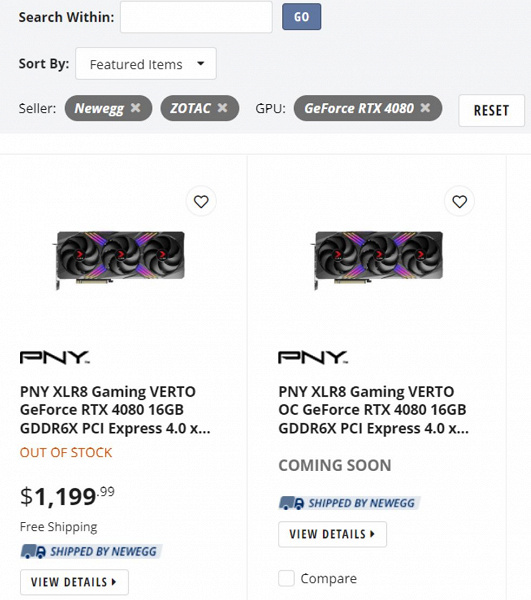 Так, на сайте Newegg представлены два варианта GeForce RTX 4080 — PNY XLR8 Gaming VERTO GeForce RTX 4080 в обычном и разогнанном вариантах. Стоимость указана только для первого, и она составляет рекомендованные 1200 долларов. Цена версии OC будет выше, но явно ненамного. Таким образом, как минимум в США можно будет купить GeForce RTX 4080 за официальную стоимость. Другой вопрос — как быстро исчезнут такие предложения. Опыт GeForce RTX 4090 показал, что все версии по рекомендованной цене быстро раскупили, после этого цены взлетели на площадках вроде eBay. Не исключено, что это ситуация повторится и с GeForce RTX 4080.