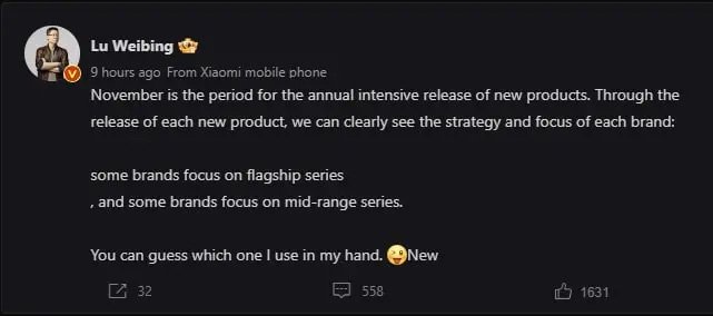 Xiaomi пока не объявила дату анонса, но глава Xiaomi Group China Лю Вейбинг (Lu Weibing) в сообщении в социальной сети Weibo намекнул, что премьера некого флагманского устройства состоится до конца ноября. Что это за флагманы, представить не трудно. Таким образом, премьеру логично ждать на следующей неделе.
