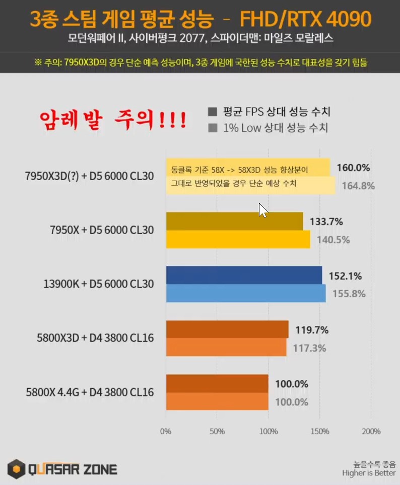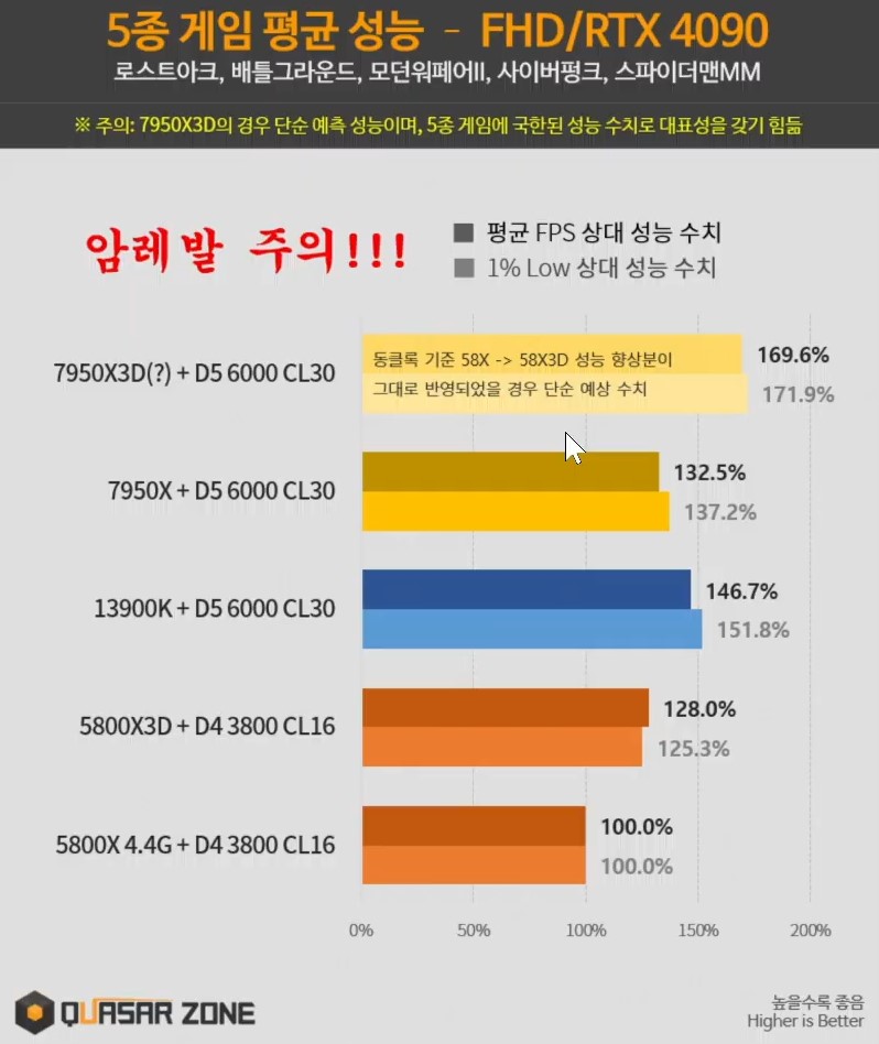 Также есть, судя по всему, прогнозируемые результаты в тестах. Вероятно, источник взял прирост, который относительно обычной версии обеспечивает Ryzen 7 5800X3D, и спроецировал это на Ryzen 9 7950X3D. В любом случае, такие результаты можно рассматривать только с точки зрения вероятности.