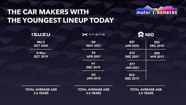 А кто же лидирует в рейтинге автомобильных брендов с самым молодым модельным рядом? На первом месте неожиданно оказалась Isuzu: ее модельному ряду 2,6 года. На втором и третьем местах «китайцы» – Xpeng и NIO.