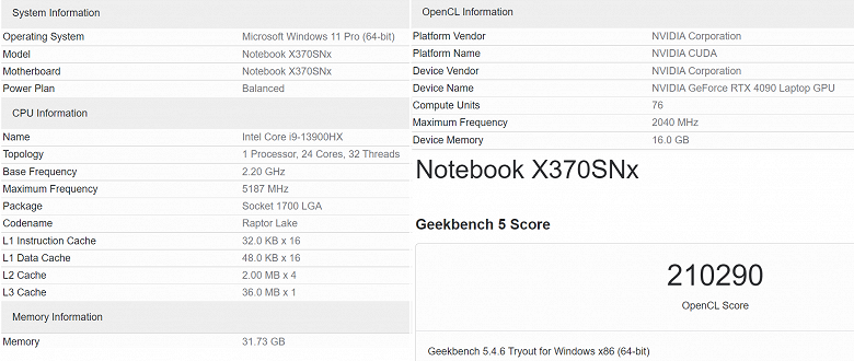Тесты Geekbench прошел некий новый ноутбук под обозначением X370SNx. Это определенно игровая модель, и совершенно точно нового поколения, так как в составе аппаратной платформы у него процессор Intel Core i9-13900HX и 3D-ускоритель Nvidia GeForce RTX 4090. Собственно, благодаря этому тесту можно судить о производительности мобильного флагмана линейки Ada Lovelace.