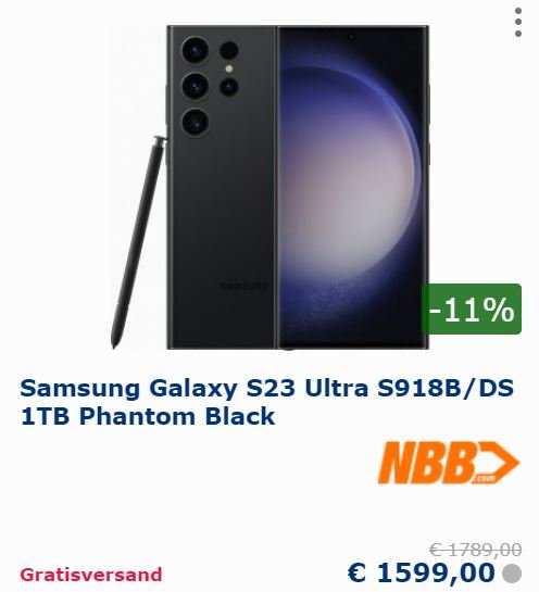 А в Германии приличная скидка на топовый Galaxy S23 Ultra с 1 ТБ памяти: вместо 1789 евро его можно купить за 1599 евро. Есть скидки и на другие варианты S23 Ultra, но они чуть поменьше – 9% на S23 Ultra с 512 ГБ флеш-памяти и 10% на Galaxy S23 Ultra с 256 ГБ флеш-памяти.