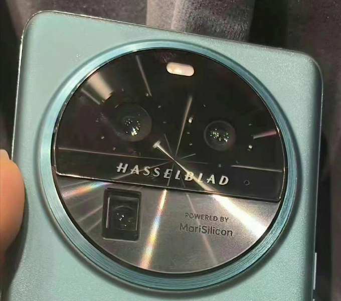 На снимке крупным планом показана верхняя часть задней панели, где расположен блок камеры. Она включает три датчика изображения, один из которых оснащен перископическим объективом для оптического зума. Там же присутствует надпись, которая указывает на использование фирменного чипа MariSilicon.