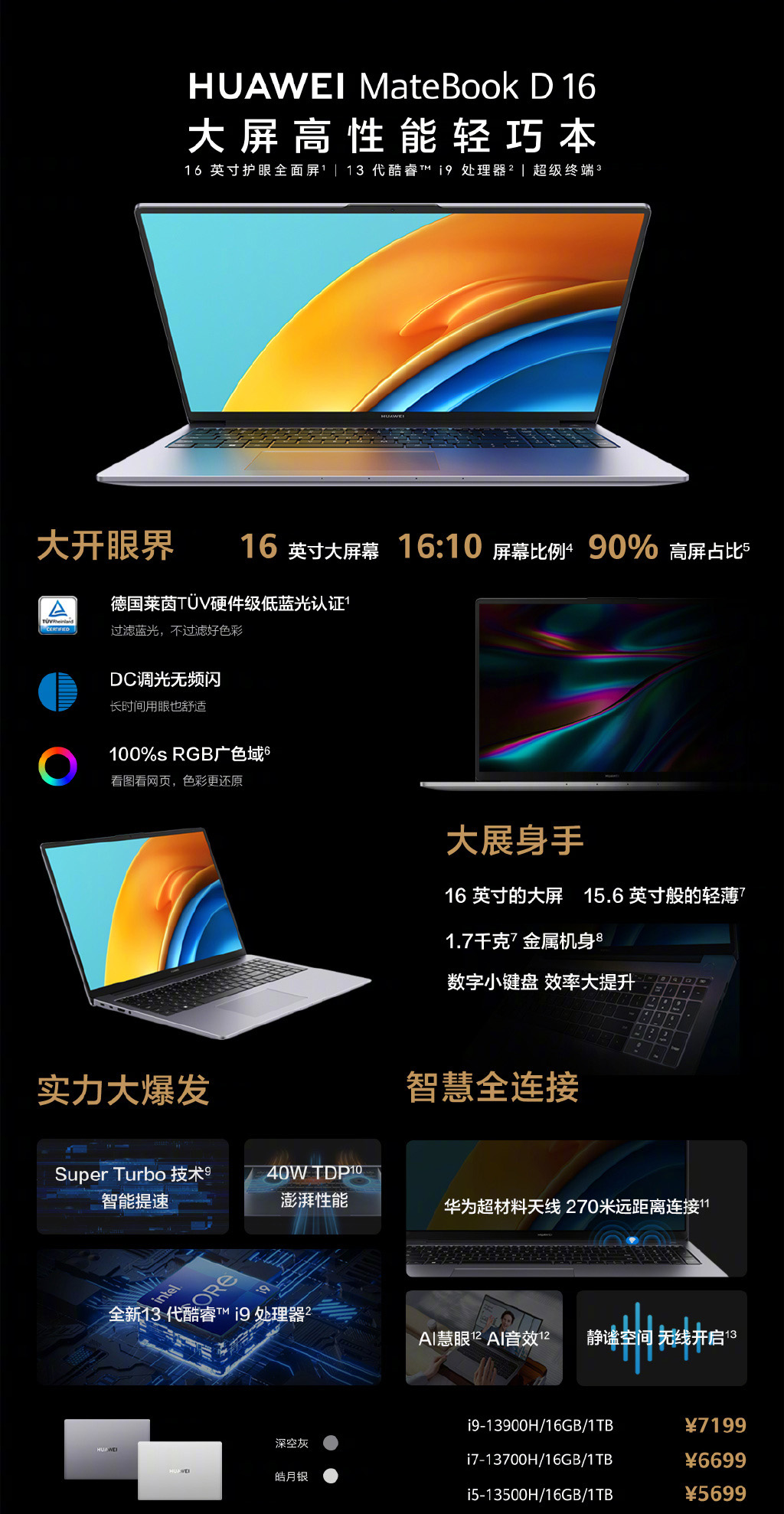 Intel Core i5-1340P, 16 ГБ ОЗУ, SSD объемом 512 ГБ – 740 долларов; Intel Core i7-1360P, 16 ГБ ОЗУ, SSD объемом 1 ТБ – 890 долларов.Huawei Matebook D16 стал первой моделью производителя с процессором Intel Core i9 – такой входит в топовую конфигурацию. В версиях попроще – процессоры Core i5 и Core i7.