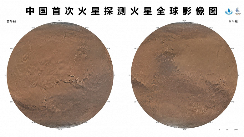 Иллюстрация: CNSA Это цветная карта восточного и западного полушарий красной планеты с пространственным разрешением 76 метров на пиксель.
