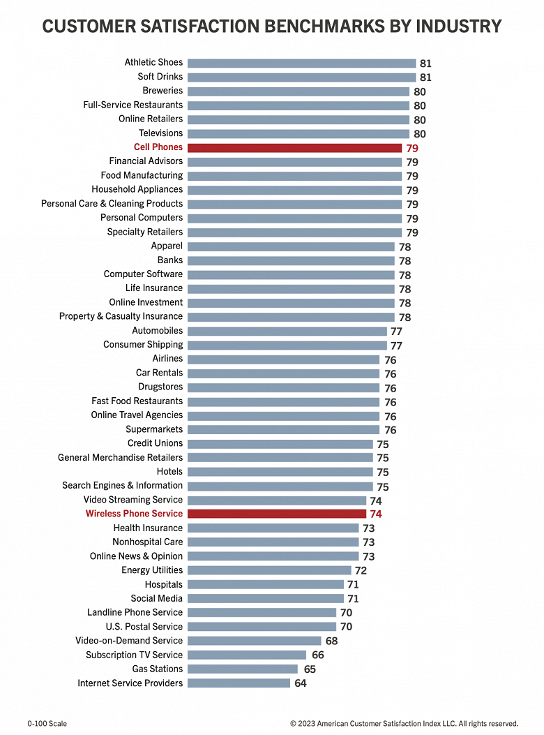 Сотрудники American Customer Satisfaction Index опросили почти 16 тыс. американцев с апреля 2022 года по март 2023 года. Модели 5G-смартфонов от Apple и Samsung получили по 81 балла, модели iPhone без 5G набрали 78 баллов, а телефоны Samsung без 5G заработали 74.