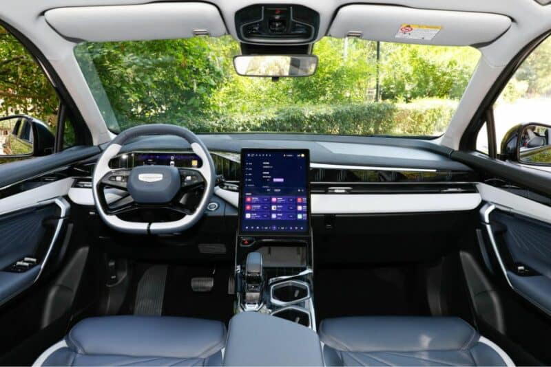 В оснащение выходят 10,25-дюймовая ЖК-панель приборов и 13,2-дюймовый вертикальный центральный экран управления на базе Qualcomm Snapdragon 8155 с операционной системой Geely Galaxy OS Air.