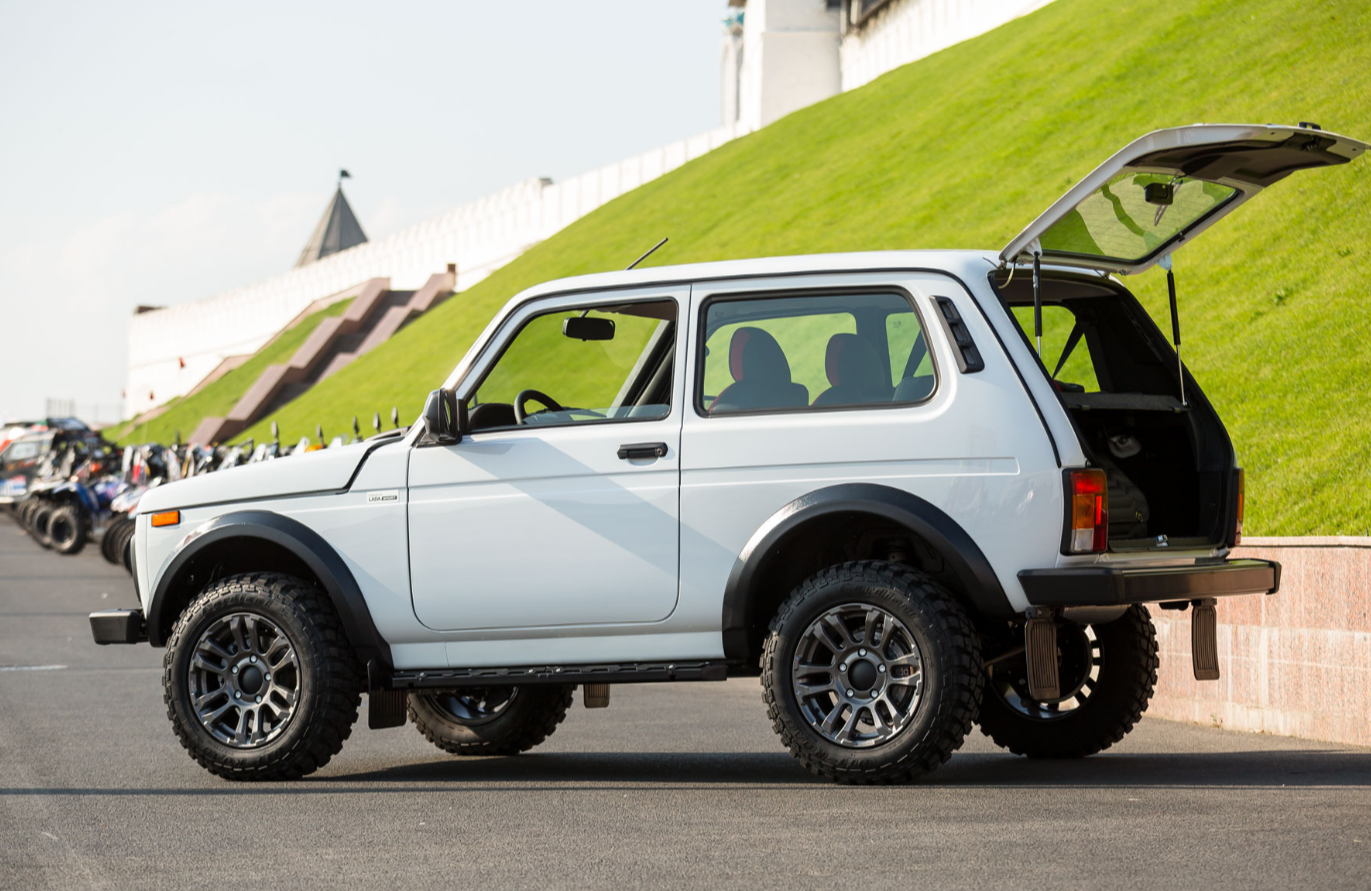 Белый внедорожник во многом повторяет серебристую «Ниву» из Тольятти с аналогичными шильдиками Powered by Lada Sport. Обо автомобиля получила «грязевые» шины Cordiant Off-Road размерности 205/70 R16.