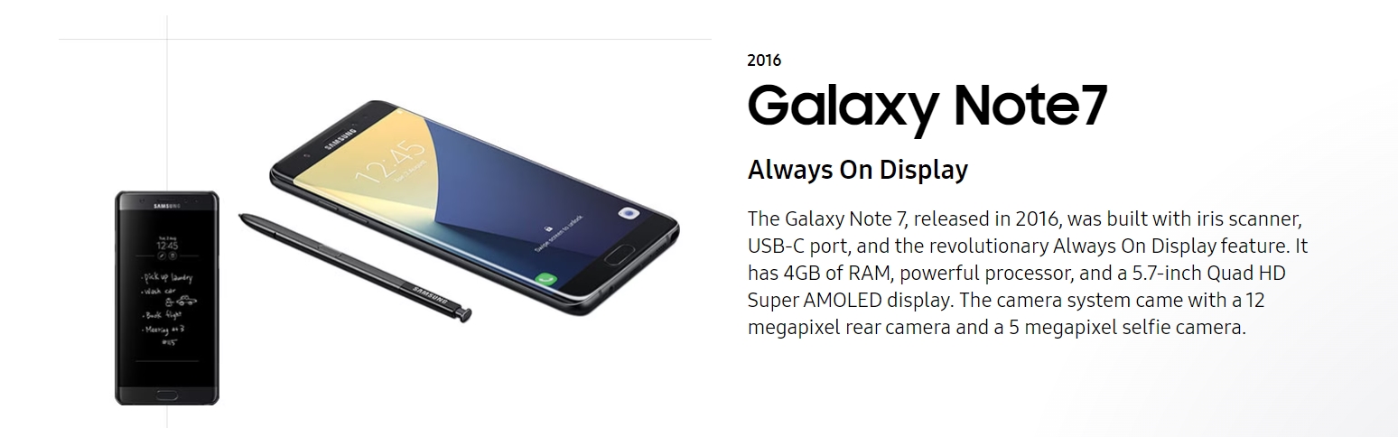 В том числе среди всех моделей Note указана и Note7 2016 года. Само собой, Samsung не упоминает, благодаря чему эта модель стала популярной, а говорит о революционной системе Always-On Display, порте USB-C, 4 ГБ ОЗУ, экране диагональю 5,7 дюйма и прочее.
