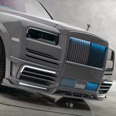 Rolls-Royce Cullinan от Mansory очень сильно отличается от стандартной модели. Mansory закрасила всю переднюю решетку, чтобы она соответствовала остальной части кузова. За решеткой также установлена синяя подсветка. Также был установлен новый бампер и другие светодиодные дневные ходовые огни.