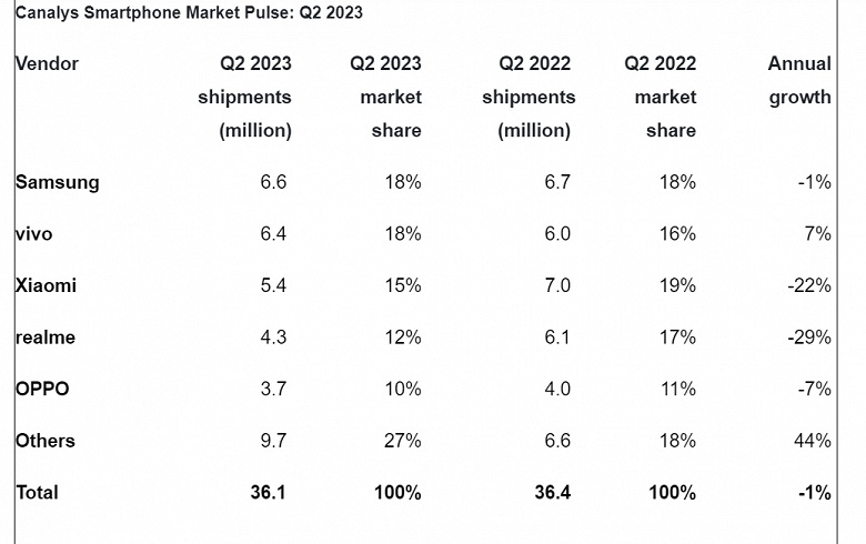 Также в пятёрку вошли Realme с 4,3 млн смартфонов и долей 12% и Oppo, которая продала 3,7 млн и заняла 10% рынка. Все компании, кроме Vivo, показали спад продаж в годовом выражении.