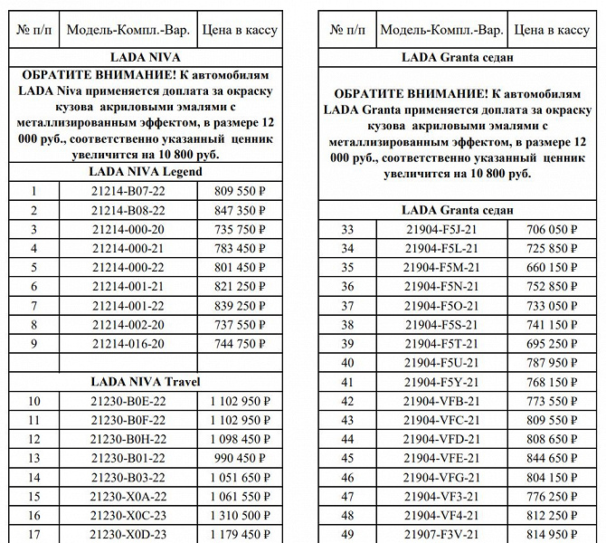 Цены ниже, чем в рознице, на 10%, плюс так как авто реализует завод, то нет и дилерских накруток за «допы». Например, если Granta в рознице стоит 735 тыс. рублей (и такой автомобиль еще надо найти), то минимальная стоимость седана, по которой авто может купить работник АвтоВАЗа, — 660 150 рублей. Lada Niva Legend предлагается по цене от 735 750 рублей, стоимость Niva Travel — от 936 450 рублей.