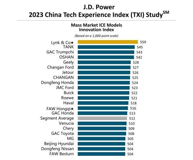 Но, например, если взять массовый рынок машин с ДВС, то тут уже бал правят «китайцы». На первом месте Lynk & Co (559 баллов), далее следуют Tank (545 баллов) и GAC Trumpchi (543 балла).