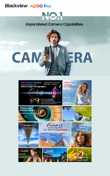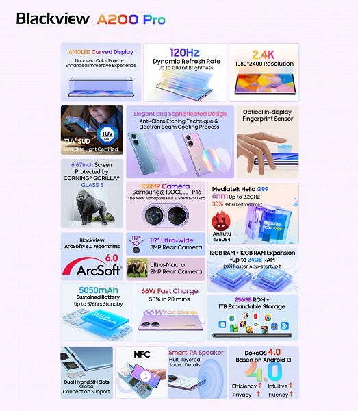 A200 Pro, с беспрецедентными прорывами в возможностях камеры с основной камерой 108MP и передовыми алгоритмами Blackview ArcSoft 6.0, изогнутым экраном 2,4K 120Hz AMOLED, совершенно новой ориентированной на бизнес DokeOS 4.0, 6nm Helio. G99, батарея 5050 мАч и поддержка быстрой зарядки 66 Вт.