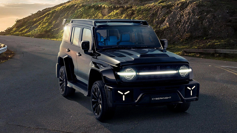 Tank 300 Cyberknight получил массивные бамперы, дополнительное освещение, встроенное в решётку радиатора, рельефный капот с акцентированным воздухозаборником, новые пороги и расширители арок. А на крыше сзади — крупное антикрыло.