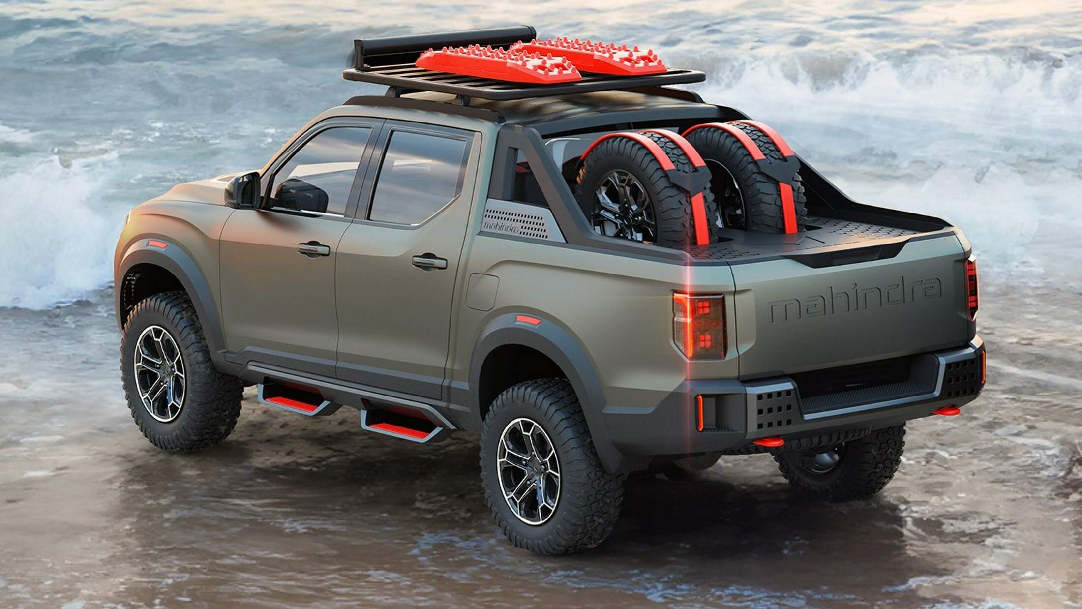 Показанный автомобиль спереди похож на Mahindra Scorpio N, но при этом он получил новые габаритные огни на решетке радиатора, дневные ходовые огни и уникальный бампер. Пикап может похвастаться заметно более длинной колесной базой и просторным кузовом за двойной кабиной.