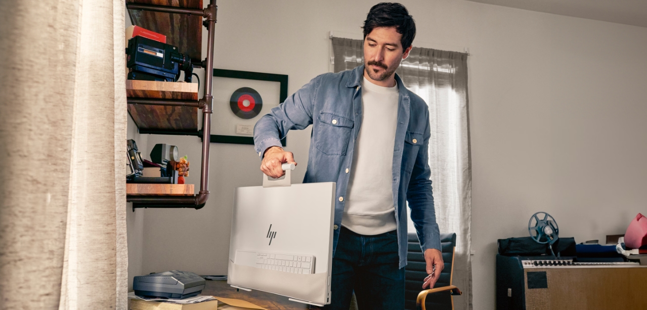 Компьютер, у которого есть ручка, ножки и карман. Представлен моноблок HP Envy Move 23.8 inch All-in-One PC