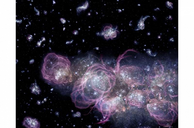 Представление художника о том, как могла выглядеть очень ранняя Вселенная (возрастом менее 1 миллиарда лет), после начала звездообразования, превращающего первичный водород в мириады звёзд. Вселенная тогда выглядела совсем иначе, чем спокойно дрейфующие галактики сегодня. На иллюстрации изображены «первобытные галактики». Внутри них появляются и исчезают яркие узлы горячих голубых звёзд, области нового звездообразования светятся ярко-красным под потоком ультрафиолетового излучения. Самые массивные звёзды самодетонируют как сверхновые. Звездообразующая галактика на переднем плане в правом нижнем углу украшена горячими пузырями от взрывов сверхновых и звёздных ветров. В этих галактиках очень мало пыли, поскольку более тяжелые элементы ещё не образовались в результате нуклеосинтеза в звёздах. Источник: A. Schaller (STScI) Цель миссии космического телескопа «Евклид» заключается в ответе на некоторые из фундаментальных научных вопросов о природе нашей Вселенной: что такое тёмная материя и тёмная энергия, которые, предположительно, составляют 95% нашей Вселенной, но не были зарегистрированы? Как работает общая теория относительности на космических масштабах? Как Вселенная приняла форму после Большого Взрыва?