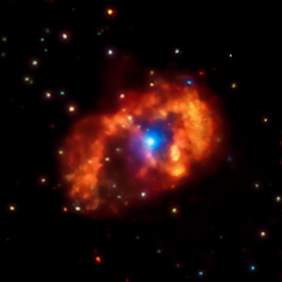 Эта Киля в рентгеновском диапазоне. Источник: NASA/CXC/GSFC/K.Hamaguchi Совместив данные от «Чандры» и обсерватории XMM-Newton, команда обнаружила, что рентгеновское излучение с течением времени ослабевает. Они сравнили данные с грубой моделью «извержения», оценив скорость и количество газа для сопоставления наблюдениям. Исходя из данных моделирования, команда считает, что «Великая вспышка», вероятно, была двухэтапным событием. Первым этапом был выброс разреженного газа с высокой скоростью, а вторым стал выброс плотного газа и пыли с меньшей скоростью, что привело к образованию туманности.