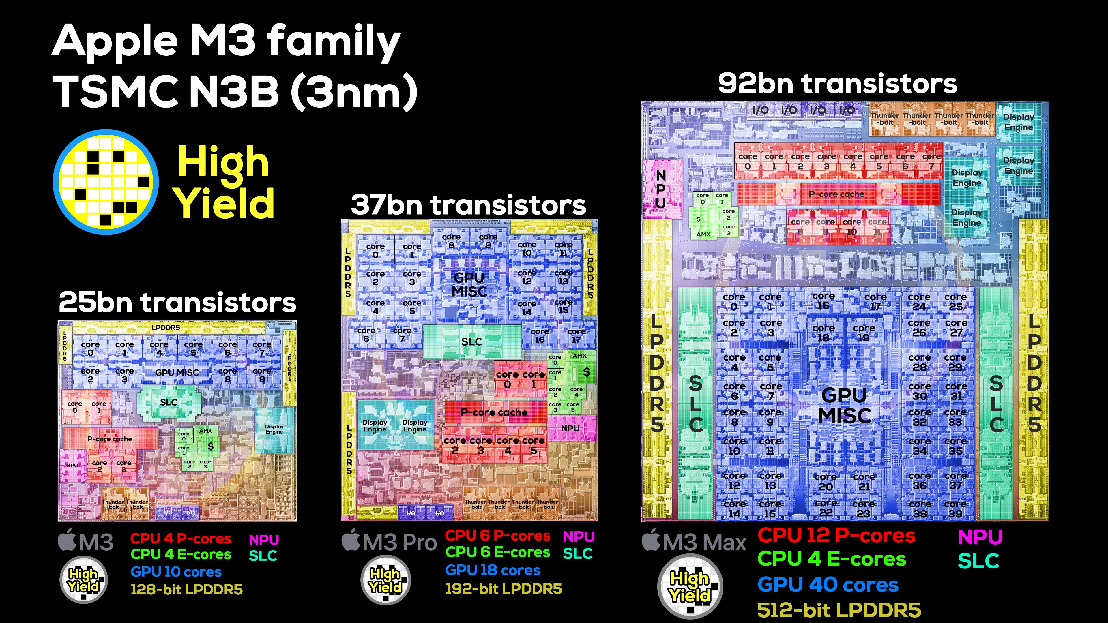 Согласно свежим данным, M3, M3 Pro и M3 Max содержат 25, 37 и 92 млрд транзисторов соответственно. Для сравнения, M2, M2 Pro и M2 Max соответственно имеют 20, 40 и 67 млрд. То есть видим, что в случае M2 Pro транзисторный бюджет был урезан, видимо, как раз за счёт удаления одного графического ядра, изменений в конфигурации ядер CPU и изменений в подсистеме питания. А вот у M3 Max количество транзисторов выросло относительно M2 Max очень сильно, но и ядер у новой SoC стало намного больше.