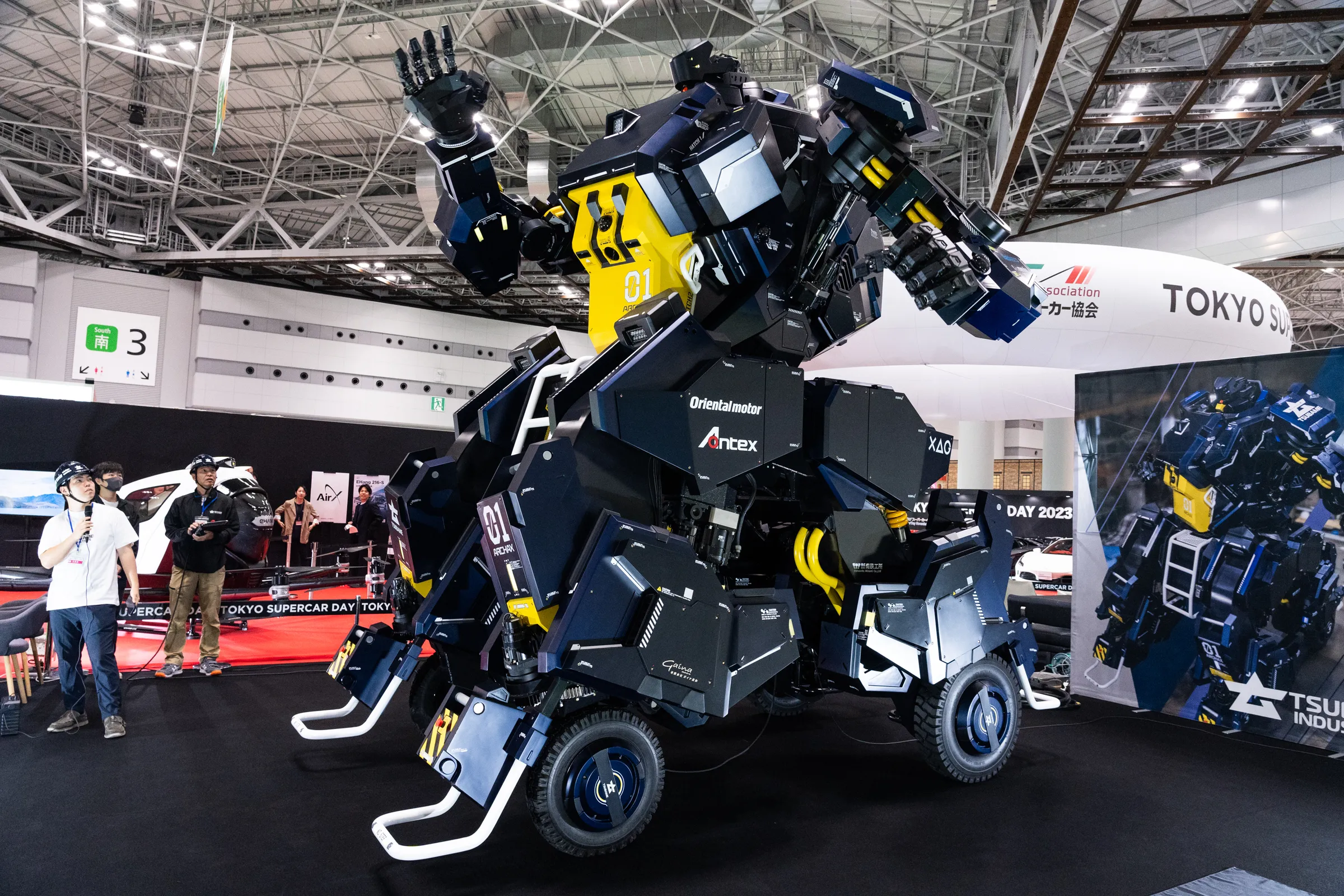 Внутри выставочного зала Tokyo Big Sight, огромного по любым меркам, Archax возвышается над «приземлёнными» суперкарами и концептуальными автомобилями, которые усеивают пространство. Примерно каждый час сотрудники Tsubame запускают простую демонстрацию, где Archax поднимает руки, машет толпе и переходит из режима робота в режим автомобиля и обратно.