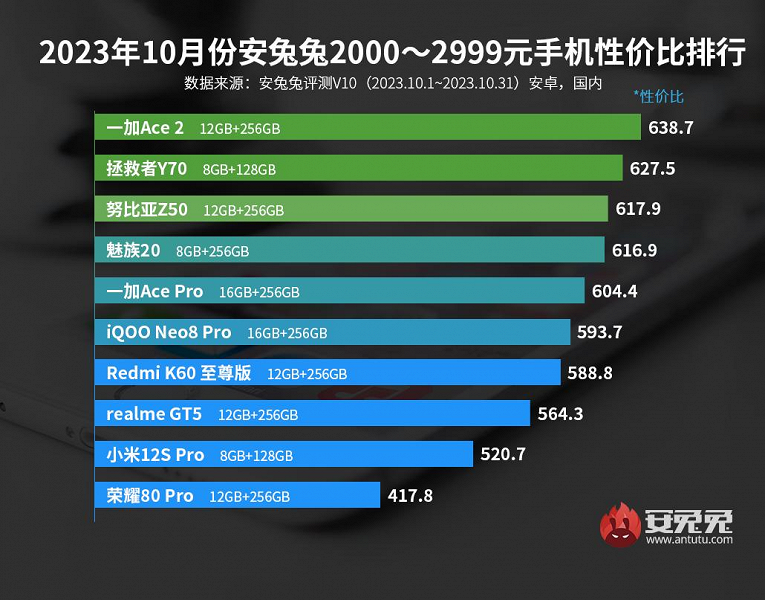 В категории от 2000 до 2999 юаней (от 274 до 409 долларов) первое место занимает OnePlus Ace 2, второе – Lenovo Legion Y70, а третье — Nubia Z50 на основе Qualcomm Snapdragon 8 Gen2.