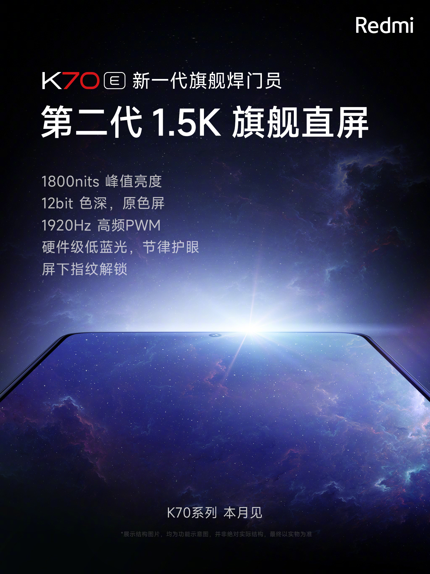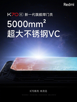 В основе Redmi K70E будет SoC Dimensity 8300-Ultra, за охлаждение которой будет отвечать большая испарительная камера с площадью 5000 мм2. Аппарат получит экран с разрешением 1,5К и кадровой частотой 120 Гц и аккумулятор емкостью 5500 мА·ч с поддержкой быстрой проводной зарядки мощностью 90 Вт. Redmi K70E станет первым смартфоном Xiaomi с поддержкой алгоритма Xiaomi Starfish, позволяющего продлить время жизни батареи: эффективная емкость аккумулятора после 1000 циклов разрядки/зарядки составит не менее 90%.