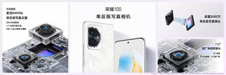 В отличие у Honor 100 Pro, оснащенного тройной основной камерой, в основной камере Honor 100 модулей только два. Главный – 50-мегапиксельный Sony IMX906, с широкоугольным объективом и системой OIS. Дополнительный модуль – с 12-мегапиксельным сенсором и объективом с углом обзора 112°.