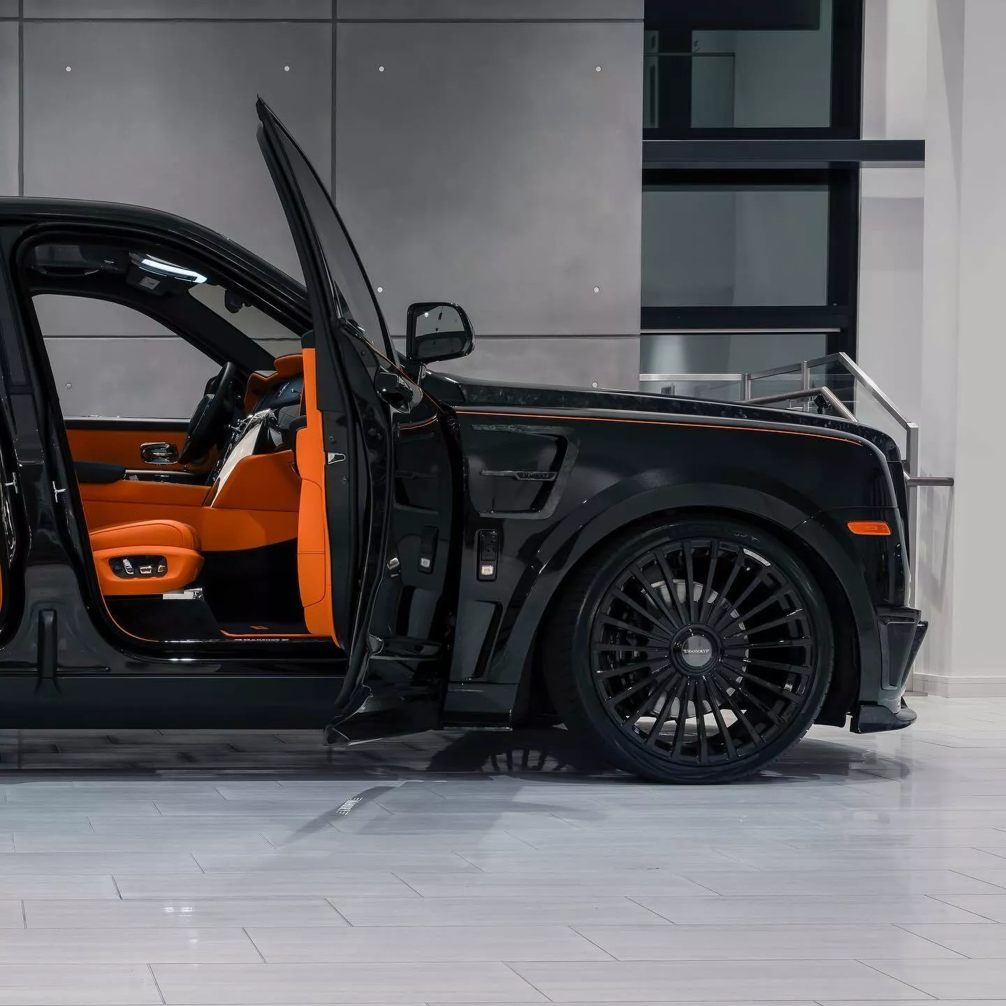 Автомобиль посажен намного ниже, чем стандартный Cullinan, а передние и задние колесные арки были расширены. Кроме того, установлены новые юбки из углеродного волокна. Глянцевая черная краска внедорожника контрастирует с ярко-оранжевой линией на кузове.