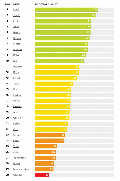 создано DALL-E Итак, если говорить о надёжности в целом, то в общем рейтинге брендов лидирует Lexus с 79 баллами, далее идут Toyota, Mini, Acura и Honda. Внизу списка Chrysler, Mercedes-Benz, Rivian, Volkswagen и Jeep. Авторы отчёта говорят, что, как и всегда, спрашивали людей о проблемах, которые у них возникли с транспортными средствами за предыдущие 12 месяцев. В этом году было собрано данных о более чем 330 000 автомобилей 2000-2023 модельного года, включая несколько ранее представленных моделей 2024 года.