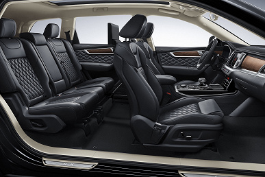 Изображение: Hongqi Машина предложена в единственной богатой комплектации Executive. Она включает в себя кресла с наппа-кожей (сиденья первого и второго рядов – с подогревом и вентиляцией), потолок, обитый алькантарой, кожаный руль с электрорегулировками, трехзонный климат-контроль, экраны для пассажиров второго ряда, вмонтированные в передние кресла сзади.