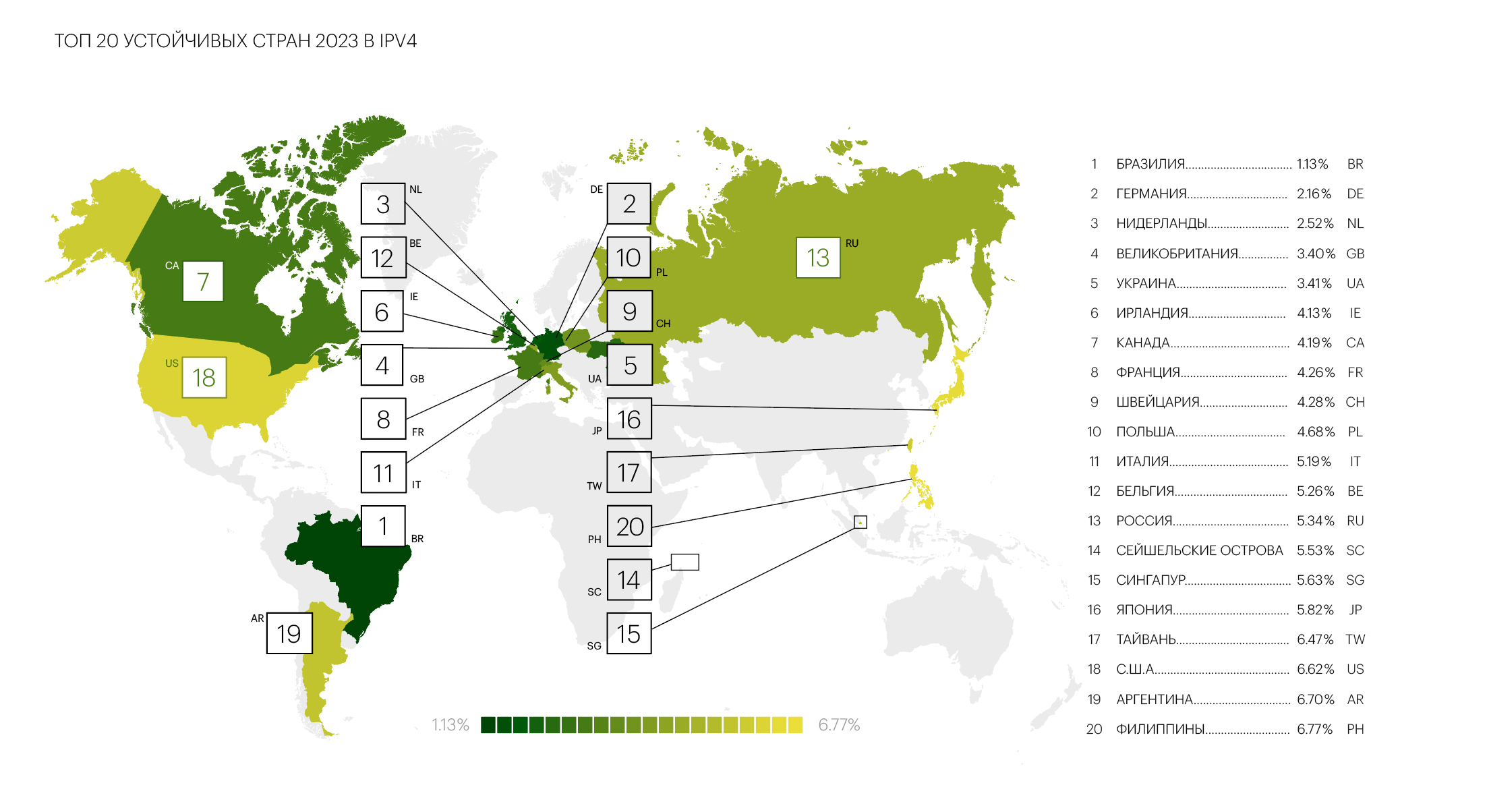 Как отметили в Qrator Labs, рейтинг отказоустойчивости интернета который год подряд демонстрирует устойчивый тренд планомерного улучшения связности. Бразилия, Германия, Нидерланды прочно удерживаются в Топ-3 уже два года, а значит, число связей между их автономными системы настолько велико, что отказ критической автономной системы не приведет к недоступности этих регионов.