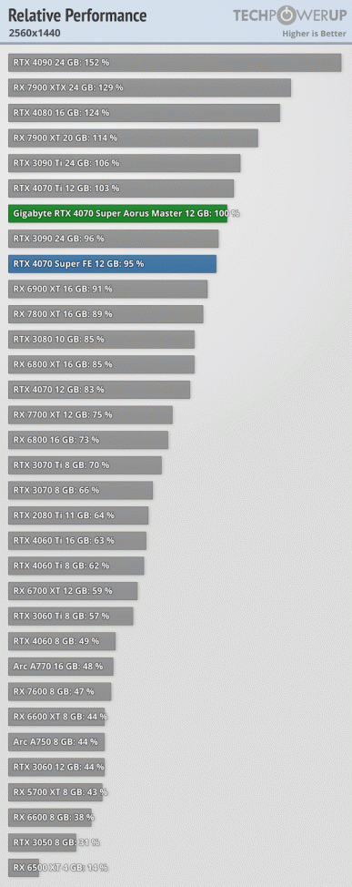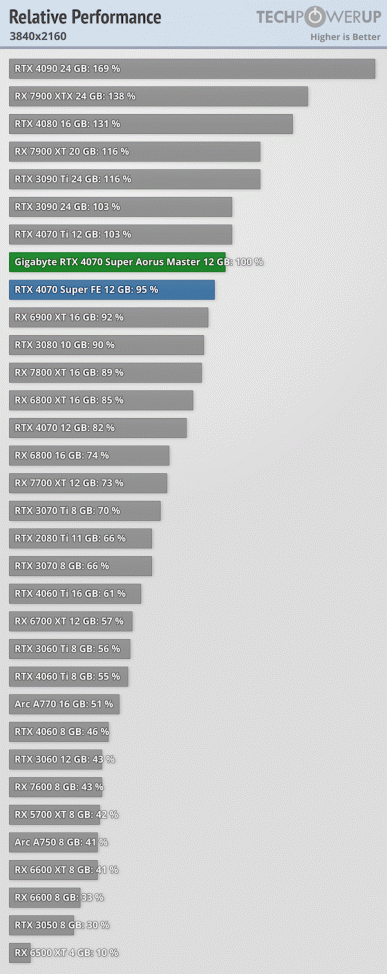 Благодаря тому, что GPU этой модели работает на повышенной до 2655 МГц частоте, а лимит мощности поднят до 245 Вт, эта карта быстрее референсной настолько, что отрыв от RTX 4070 Ti сокращается до 2-3%. Более того, эта модель Gigabyte отлично разгоняется, позволяя дополнительно повысить производительность на 6%, и таким образом сделать RTX 4070 Super быстрее, чем референсная RTX 4070 Ti.