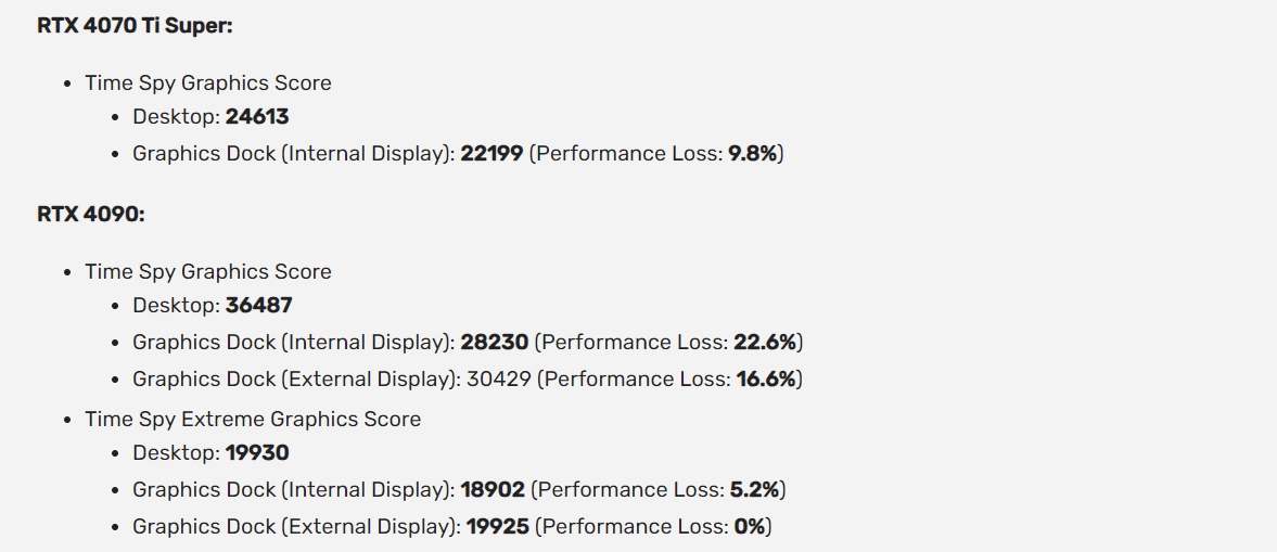 Тесты показывают, что даже для RTX 4070 Ti Super речь идёт о 10%. Это немного, но это и не флагманская 3D-карта. А вот RTX 4090 теряет уже до 22,6%. Правда, это результат в 3DMark Time Spy при использовании экрана ноутбука. При подключении внешнего дисплея падения меньше (16,6%), а в Time Spy Extreme оно и вовсе падает до 5,2% в случае родного экрана и до 0% в случае внешнего монитора.