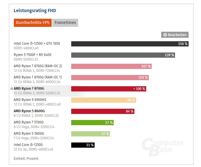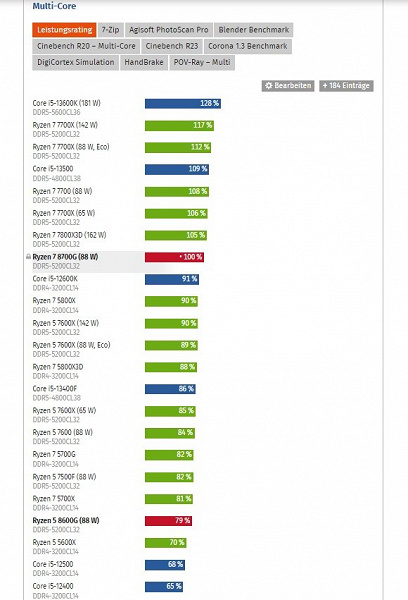 Что касается процессорной части, тут всё проще. Ryzen 7 8700G — это почти Ryzen 7 7700X, так как их параметры очень близки. Соответственно, Ryzen 5 8600G выступает примерно на уровне Ryzen 5 7500F. При сравнении с Intel в первом случае конкурентами выступают Core i5-12600K и Core i5-13500, а во втором — Core i5-12500.