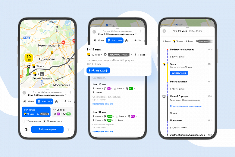 Приложение предложит комбинированный маршрут, если он будет быстрее других вариантов. Оно само выберет оптимальную станцию МЦД, учитывая общее время в пути, ситуацию на дорогах и количество пересадок. Заказать такси можно прямо на этапе выбора маршрута.