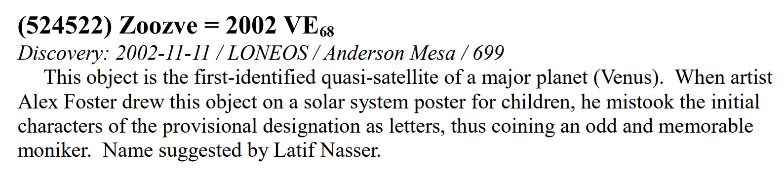 Исследователь и соведущий Radiolab, а также ведущий шоу Netflix Connected Латиф Нассер, заметил на плакате Солнечной системы, который он повесил на стену своего двухлетнего ребёнка, название Zoozve. Увидев незнакомое название, он решил выяснить его происхождение и связаться с NASA и иллюстраторами плаката. Результатом этих контактов стало обнаружение ошибки иллюстратора в прочтении собственного почерка: «Zoozve = 2002VE».