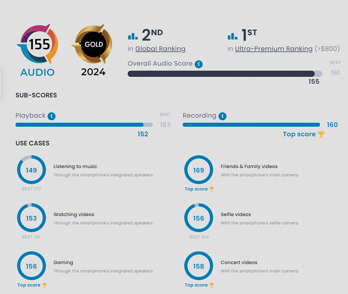 В глобальном рейтинге звука у Honor Magic6 Pro 156 баллов — столько же, сколько у игрового Asus ROG Phone 6. А на первом месте Black Shark 5 Pro со 161 баллов.