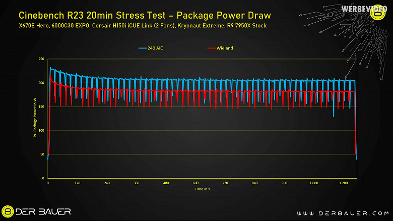 Оказалось, что беспомповая система вполне себе жизнеспособна. Да, под максимальной нагрузкой, в данном случае в виде бенчмарка Cinebench R23, охладитель Corsair справился лучше, выиграв 8 градусов (70 градусов против 78 градусов). Однако, во-первых, оба результата вполне неплохи, учитывая тестовый 16-ядерный Ryzen 9 7950X, а во-вторых, в играх разницы между СО вообще не было, то есть не будет её и в среднестатистических нагрузках.