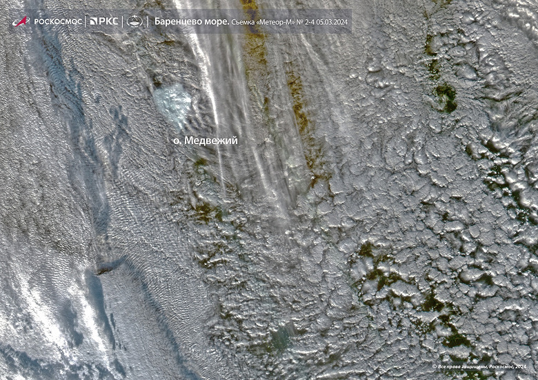 Гидрометеорологический космический аппарат «Метеор-М» № 2-4, запущенный на орбиту на прошлой неделе, прислал первые данные, полученные с помощью одного из целевых приборов — комплекса многозональной спутниковой съёмки (КМСС-2). Прибор был впервые включён вчера, 5 марта, в 15:27 по московскому времени. Специалисты получили первые изображения Арктики (акватория Баренцева моря около архипелага Шпицберген).