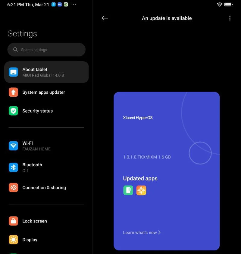 Пользователи Xiaomi Pad 5 за пределами Кита начали получать бета-версию HyperOS под номером 1.0.1.0.TKXMIXM. Пока она доступна только для участников программы Mi Pilot. Если не будет найдено никаких критических багов, то система выйдет в качестве обновления по воздуху для всех пользователей устройства. Размер обновления составляет 1,6 ГБ.