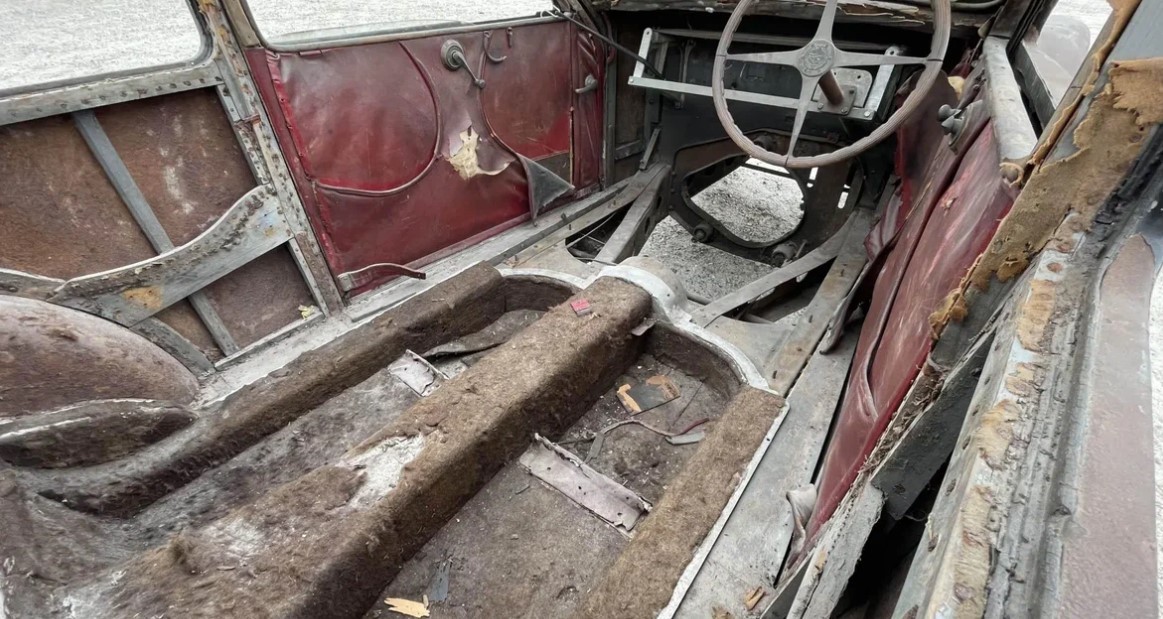 Кузов весь прогнил, автомобиль не может самостоятельно передвигаться. Двигатель и почти все элементы интерьера демонтированы, тормоза не подключены. Некоторые детали пропали.