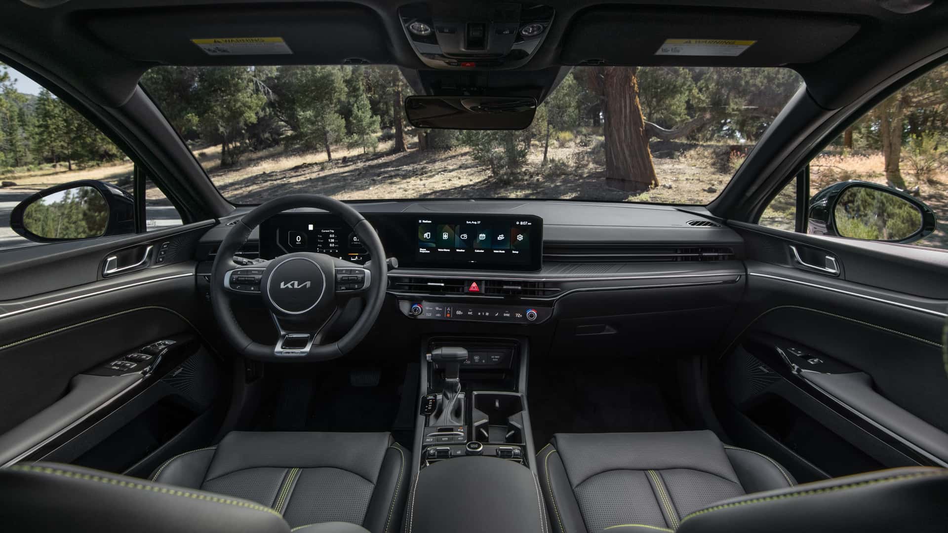 Внешне Kia K5 2025 ничем не отличается от прошлогодней модели, ключевое отличие внутри — переработанная передняя панель с двумя 12-дюймовым экранами в одном блоке. Медиасистема поддерживает беспроводные интерфейсы Apple CarPlay и Android Auto во всех комплектациях авто.